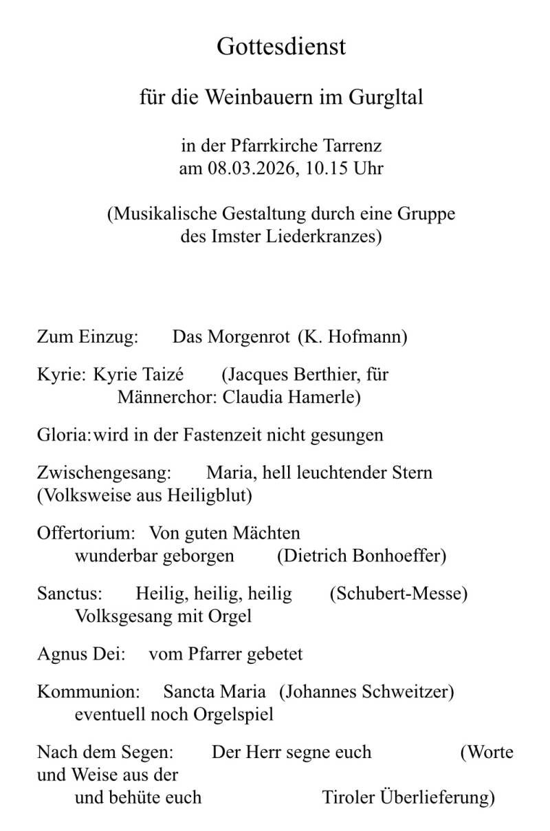 Der Sonntag - 8.3. - stand ganz im Zeichen "20 Jahre Weinbauverein Tarrenz" und aus diesem Anlass traf sich das Doppelquartett um 9.30 Uhr in der Pfarrkirche Tarrenz und sang sich dort für die bevorstehende Messe ein. Wir umrahmten den Gottesdienst - gelesen von Dekan Franz Angermayer - mit einigen Liedern wofür er sich herzlich und mit launigen Worten bedankte (sprich: Der Liederkranz ist heute auf seiner Welttournee in Tarrenz vorbei gekommen). Nach der Messe gab es vor der Kirche eine Agape mit guten Tropfen und selbstgebackenem Brot aus Tarrenz und einen "gemütlichen Ratscher". Kurz vor 12 fuhren wir zum Gurgltaler Hof und wurden abermals mit guten Tropfen, Tarrenzer Weinsuppe und Wiener Schnitzeln kulinarisch verwöhnt. Mit drei Liedern unterhielten wir die "Weinbauern" ehe es um 14 Uhr wieder in Richtung Imst ging. Vielen herzlichen DANK für die Bewirtung vor der Kirche und im Gurgltaler Hof!
